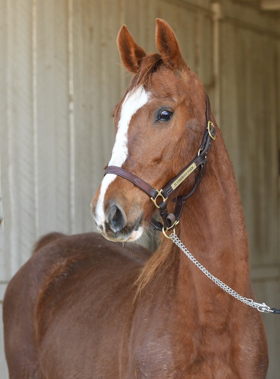 MARKINGS: Star, connected stripe and snip to upper lip, partial right front coronet, both hind stockings, white