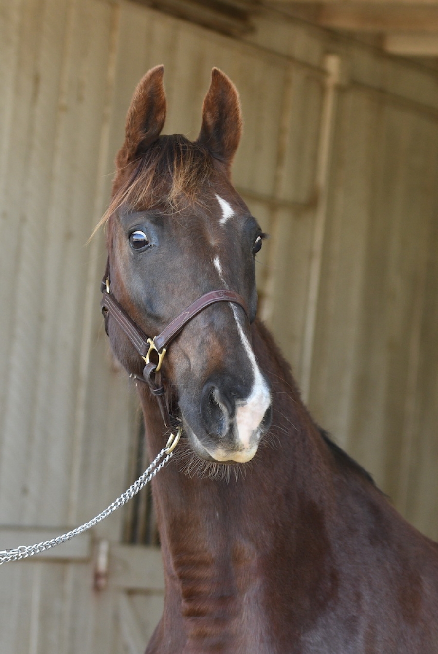 MARKINGS: Offset star, few hairs on bridge of nose above short narrow stripe, connected snip to upper lip, right front sock, left front ankle higher in back, both hind stockings, white