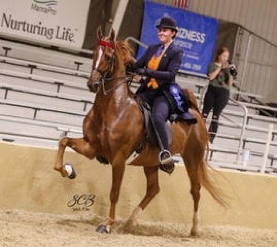 CONSIGNOR'S STATEMENT: This flashy mare has the talent and work ethic to have a successful show career. Doubletrees Tame This is by WCC sire WGC CHMarc Of Charm and she is a half sister to the many-time World's Champion CHI'm A Holiday and RWC Pinekrest's Born To Perform. Her second dam is a full sister to RWGC CHThe Groomsman and WC Harlem's Bluebelle, etc. Her third dam is the famous WC Belle Supreme GTR (BHF). She is ready to head to the show ring with her next owner.